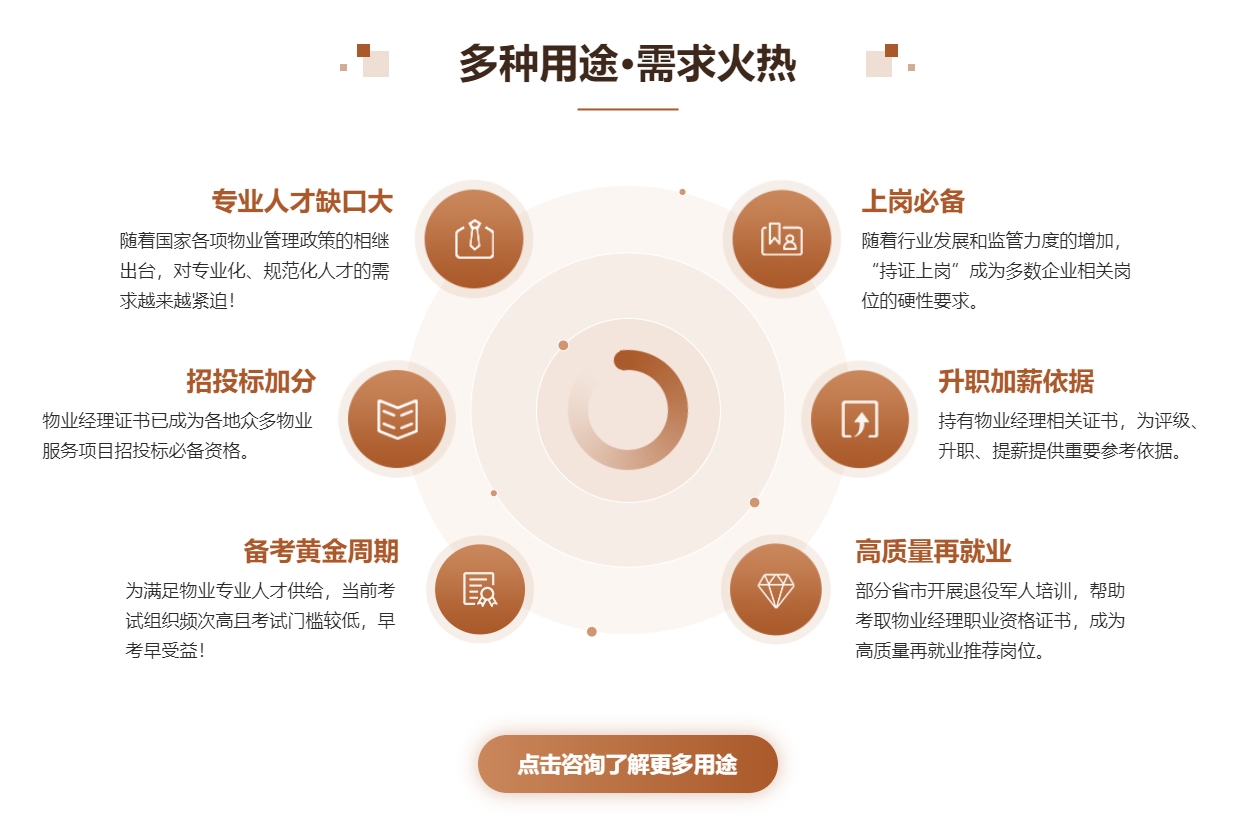 报考物业经理证书在哪里报名 需要哪些材料 物业经理人乃是投身于物业管理领域的专业人才。自 1999 年起,物业经理人开始施行持证上岗制度。物业经理人岗位证书系由建设部颁发,其岗位职务涵盖经理、经理助理、总经理、副经理、副总经理、管理员等多种选择,而全国物业行业项目经理职业资格证书的岗位职务则为项目经理。当下,报考此证书乃是注册物业公司获取资质的必备之证,亦是物业公司年审及招聘的必要条件,该证书的含金量颇高且实用性极强。物业经理考核标准、报考条件及报名材料 物业经理证对于学历和工作年限并无要求,仅物业管理师有此方面的要求。报考物业经理证,仅需提供:2 寸蓝底彩色照片三张(或电子版照片),身份证正反面复印件一份。 物业经理的用途 物业公司年审时可用,关注国信弘创小马微信公众号获取更多报考详情并且就未来的发展趋势而言,物业经理上岗证将会成为从业准入。 注册物业公司时需要,每家物业公司注册时最少需要五名持有经理证的员工。 应聘工作和企业提升资质时同样需要。 物业岗位日常工作 物业经理证是否为必考证书?其含金量怎样? 答:存在必有其因由,从事此行业拥有多个证书定然优于无证之人,至于含金量,实则更侧重于个人的管理水平,有证书无疑会更增光彩。