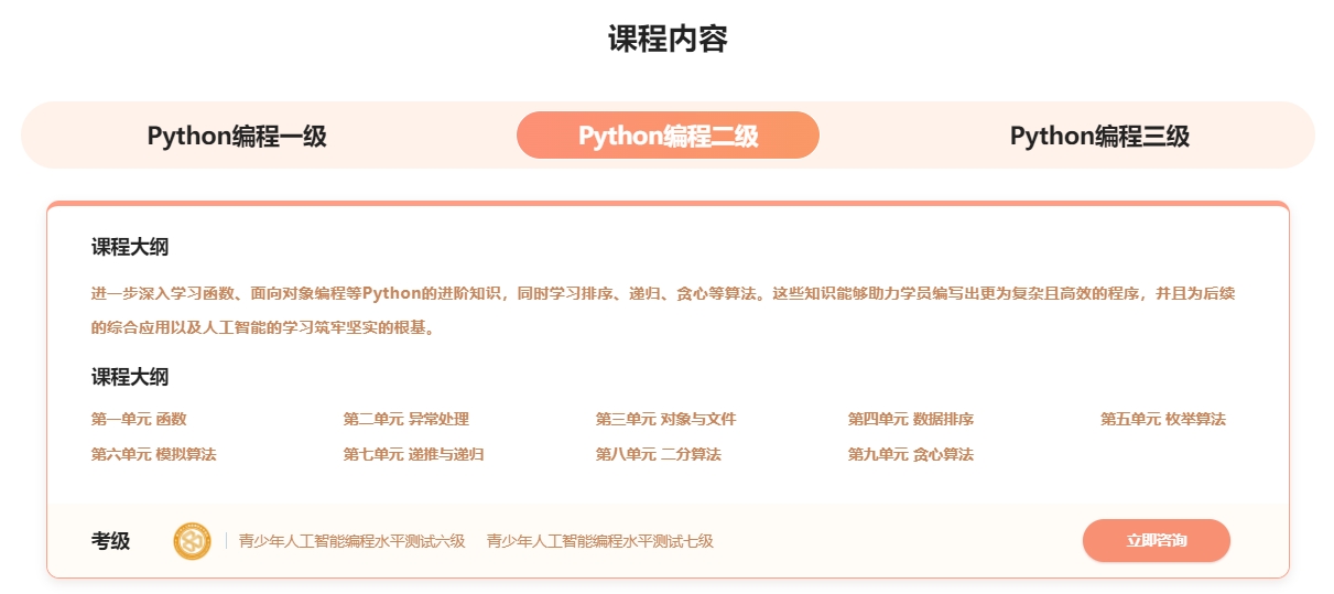 Python少儿编程为儿童成长带来多维价值,其核心优势可归纳为以下八个方面: 1. 逻辑启蒙工具 编程本质是逻辑思维的具象化训练。Python简洁的语法结构(如缩进规则、自然语言化指令)帮助儿童快速建立"条件判断-循环执行-函数封装"的思维框架。通过编写计算器、排序程序等项目,孩子能直观理解因果关系与问题拆解方法,这种训练效果较传统逻辑题更具场景化特征。 2. 创意实现载体 Python的模块化特性(如Turtle图形库、Pygame游戏引擎)为儿童提供低门槛创作平台。孩子可通过代码绘制几何图案、开发互动游戏,甚至设计简易AI程序。这种"想法即代码"的创作模式,能激发儿童将抽象思维转化为实体成果的能力,培养创新实践意识。 3. 未来技能储备 Python在人工智能、数据分析等前沿领域的核心地位(全球TIOBE指数连续多年位居前三),使其成为数字经济时代的"新读写能力"。掌握Python的儿童,在智能硬件开发、数据可视化等STEM领域具备先发优势,更易适应未来职业结构变革。 4. 问题解决范式 编程训练要求儿童将复杂问题分解为可执行的步骤链。例如开发天气查询程序时,需完成数据获取→解析→展示的全流程设计。这种"定义问题-设计算法-验证结果"的思维模式,可迁移至数学建模、科学实验等场景,培养系统性问题解决能力。 这种"思维训练+技能储备"的双重价值,使Python少儿编程成为培养未来人才的关键路径。建议家长结合儿童认知发展规律,选择图形化编程到代码编程的渐进式学习方案,最大化编程教育的长期效益。
