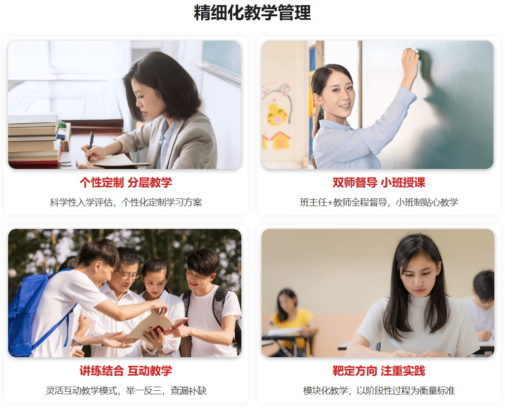 根据不同学生的基础,安排不同的班级,有基础班、提高班、培优班,不同班型授课内容不同,确保教学的针对性,从而保证各类学生的提成快速提升。