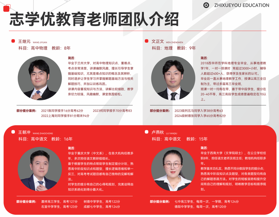 志学优教育成立于2013年,我们是一家专注高中生文化补课的机构。学校经过十余年的发展,目前拥有300多名教职工,累计输送高中生达到1w名+。目前机构以全日制补课为核心产品,围绕全日制同学提分研发出“学-练-考-管”四维一体的提分解决方案,帮助希望通过全托模式快速提分的高中生考入梦想的大学。志学优教育秉持定要给学生用好老师的办学理念,我们每学期都会在面向整个成都进行统一招聘,老师全部采取资格审定+笔试+试讲的选拔流程。凡是教学经验低于6年的,不允许参加笔试。凡是笔试成绩100分满分低于90分的,不允许参加试讲。凡是试讲总结不到位,不能明确高考题型的,不通过试讲。正是在这种严苛的选拔机制下,一批批优秀的,稳定的,有教学能力的老师被志学优选拔出来,最终来到了我们同学面前。