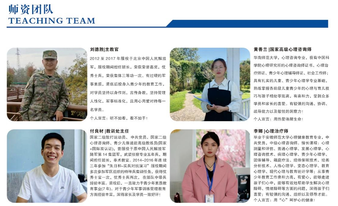 军事训练+心理辅导+素质教育+ 脑力课程开发+感恩教育,+法治教育+演讲与口才培训+行为和时间管理+文化课兴趣班+家庭教育咨询(全方位、综合性的提升和解决青少年及家庭的问题和困难)