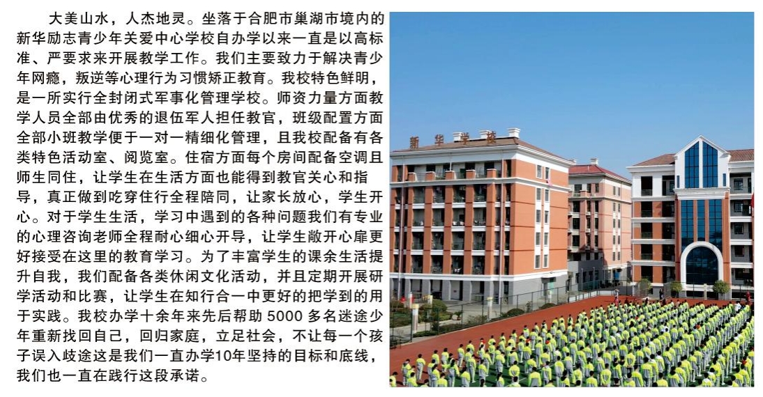 1、巢湖新华励志青少年关爱中心-以高标准、严要求办学,专注解决青少年网瘾、叛逆等心理行为问题。