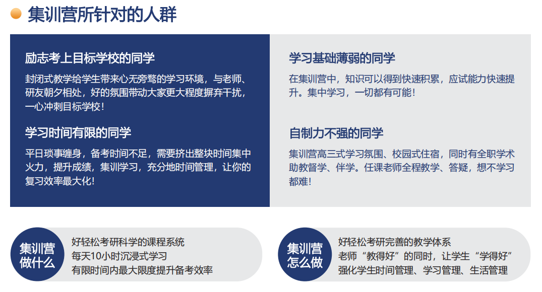 新航道国际教育集团 (New Channel International Education Group) 由英语教育专家与教学管理专家胡敏教授创办于2004年。“新航道”三个字源于胡敏教授创办机构时对其二十一年教育实践经验的总结,下决心在大学的“庙堂英语”和培训机构的“江湖英语”之间开辟语言教育的新航道。好轻松考研集训营是新航道旗下高端考研培训品牌,坚持小班教学(10人小班)、全程规划,全日制、高三式、吃住学一体式的教学服务。