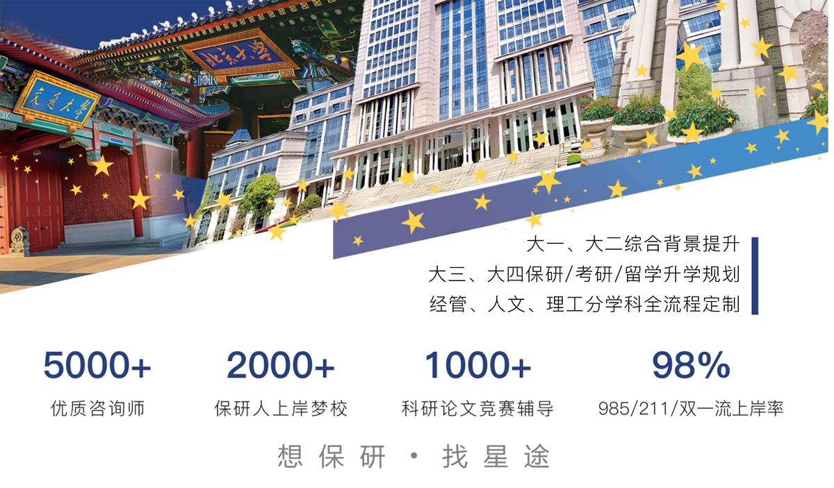 保研星途秉持“冲刺名校、对结果负责”的理念,由清华、北大等985高校硕博创立,专注本科生科创与升学规划。自2020年启动保研、科研竞赛服务,逐步构建全链路服务体系。2021年推出“保研星途”品牌,实现98.5%的985/211院校录取率。2022年助力千名学员获核心期刊论文、竞赛奖项等。2023年升级服务体系,拓展升学业务,师资超8000人。2024年建成万级导师库,以“五阶三维”模型实现精准辅导。累计助5000+学员保研至顶尖院校,产出3000+科研成果,保研录取率高达98.5%。师资团队包括2000+教授、博士及10000+硕博研究生,覆盖14大学科。辅导涵盖学业规划、竞赛指导、论文辅导、专利软著等,提供N对1全程监管服务,确保质量。选择星途,尽享高性价比、隐私保护与专业团队服务,助力学子圆梦名校。