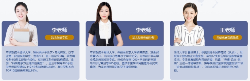 业内顶尖的保研规划与学术指导团队,核心成员包括知名高校教授、资深讲师、博士研究员及成功保研的优秀硕博研究生。权威专家领衔:2000余位拥有教授、讲师或博士学位的高层次导师,全程把关保研申请、科创能力提升及夏令营内推等关键环节。丰厚辅导力量:超1万名来自双一流高校的优秀硕博老师,凭借亲身保研成功经验,提供背景提升、精准院校定位、申请材料精修与笔面试特训。名校精英团队:4000余名毕业于清华、北大、浙大、复旦、上交、人大等顶尖学府的专业保研规划师,深度洞悉目标院校选拔要求。学科全覆盖保障:导师专业背景全面覆盖包括文、理、工、医、法、经管、艺术等在内的全部14大学科门类,确保精准匹配学员的专业方向。