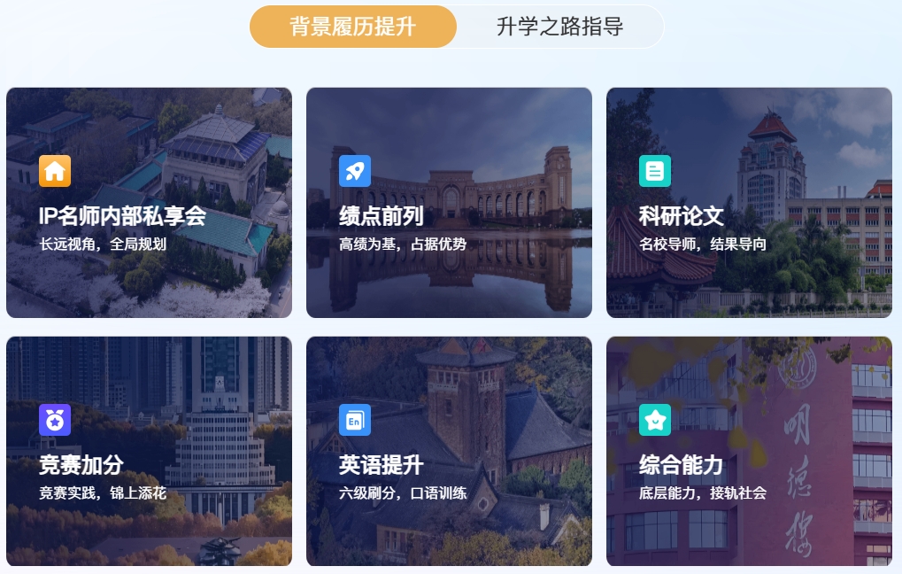 综合背景提升:围绕自我管理、资源调用与表达逻辑三大核心模块,帮助学员塑造底层能力,养成良好的学习习惯,实现个人成长效益化,更好地接轨社会,全面提升学员未来的职业发展竞争力。
