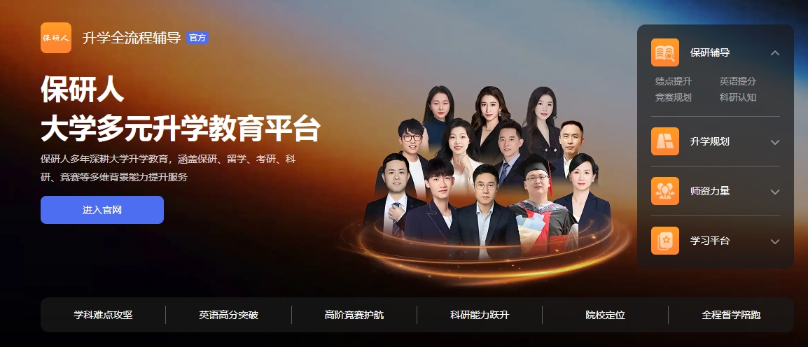 保研人是国内专注保研辅导的机构,是由清华、北大、复旦、交大等院校校友创立,是业内首家汇集清北复交全职老师的大学多元升学教育平台,助力千万大学家庭圆梦知名院校。保研人为大学生提供从大一开始的专业、品质、丰富的36项保研服务,12年深耕大学升学教育,为广大大学生提供系统有效的保研、留学、考研升学规划及绩点、科研、竞赛等多维背景能力提升服务,为业内各学科升学辅导的领军者。
