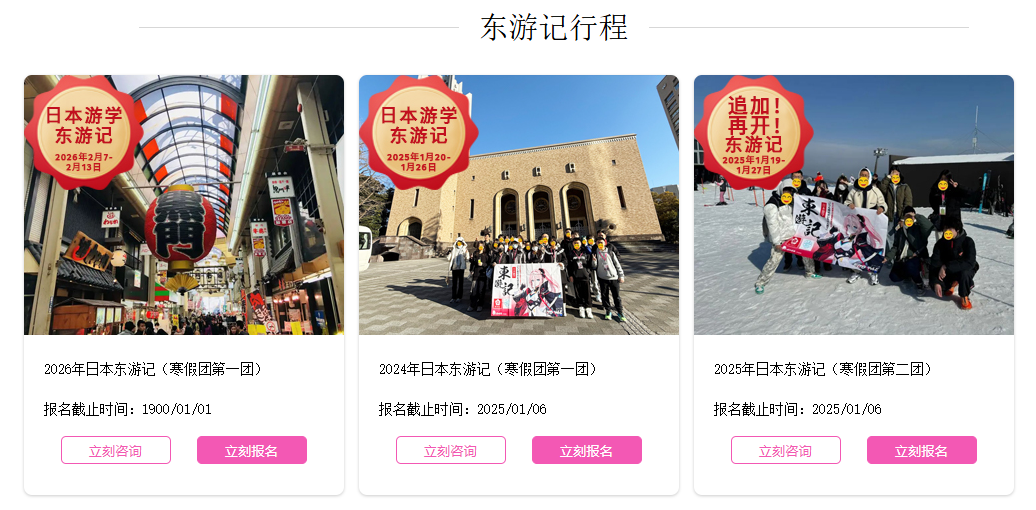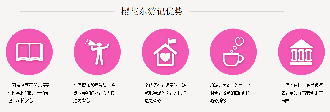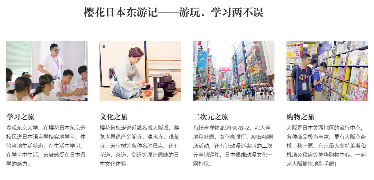 樱花国际日语开设日本短期特色游学课程:由樱花专职老师全程带队,专业的旅游公司设计行程,在樱花日本东京总部学习,边游览日本景点,游玩动漫圣地,边学习相关日语,体验日本传统和新兴文化,玩转真实日本,享受美好假期。行程更将安排参观日本知名大学,参访日本语言学校和升学私塾,为今后的留学腾飞之路提供详尽的参考和铺垫。