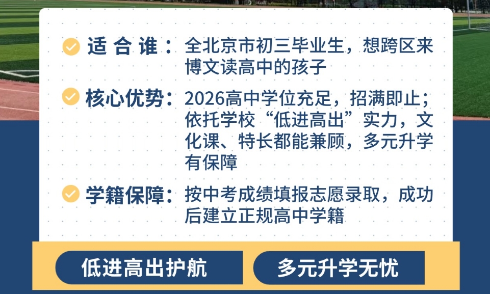 4.足球特训班,从小对足球感兴趣,可以参加博文足球训练队,有两个升学途径:(1)高水平运动员(要求一级运动员)(2)足球单招,只要达到二级运动员,目标院校校考通过,二本线就可以上清北了。