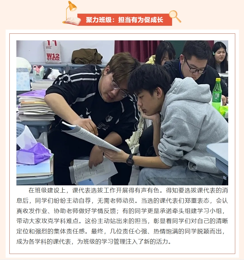 在班级建设上,课代表选拔工作开展得有声有色。得知要选拔课代表的消息后,同学们纷纷主动自荐,无需老师动员。当选的课代表们郑重表态,会认真收发作业、协助老师做好学情反馈;有的同学更是承诺牵头组建学习小组,带动大家攻克学科难点。这份主动站出来的担当,彰显着同学们对自己的清晰定位和强烈的集体责任感。最终,几位责任心强、热情饱满的同学脱颖而出,成为各学科的课代表,为班级的学习管理注入了新的活力。