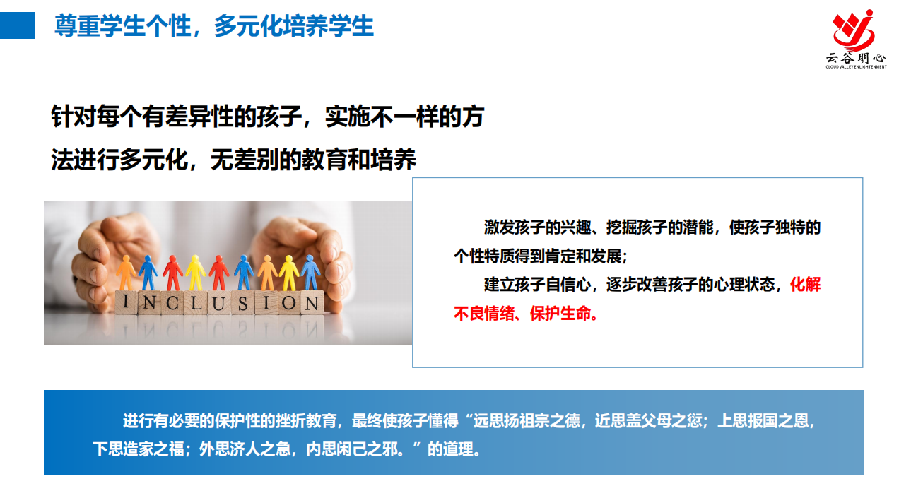 对于“不上学”孩子身上的的缺点和错误,我们不能只是做简单地判断对错,或批评指责,他们需要包容、理解,耐心、方法时间、空间,还要积极引导a他们,让孩子学会反思、觉醒、改错、学习、成长。