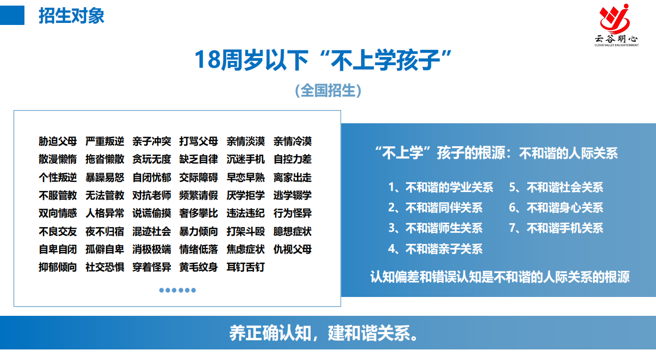 (专门针对叛逆、网瘾、早恋、厌学、休学、自卑、自闭、暴力倾向、沉迷网络游戏、夜不归宿、离家出走等青少年进行心理辅导、行为矫正,素质培养,着重亲情和心能培养的训练基地。)