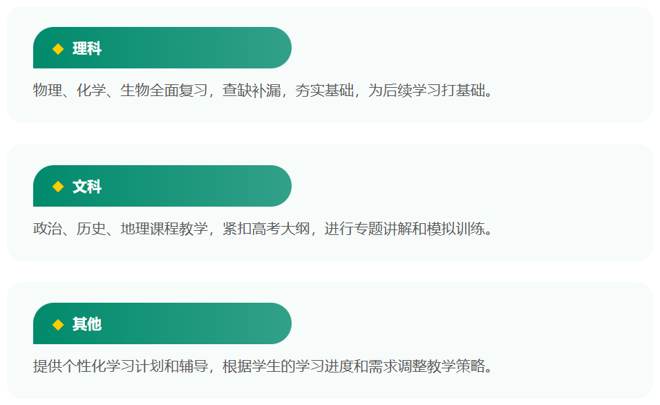 文科:政治、历史、地理课程教学,紧扣高考大纲,进行专题讲解和模拟训练。