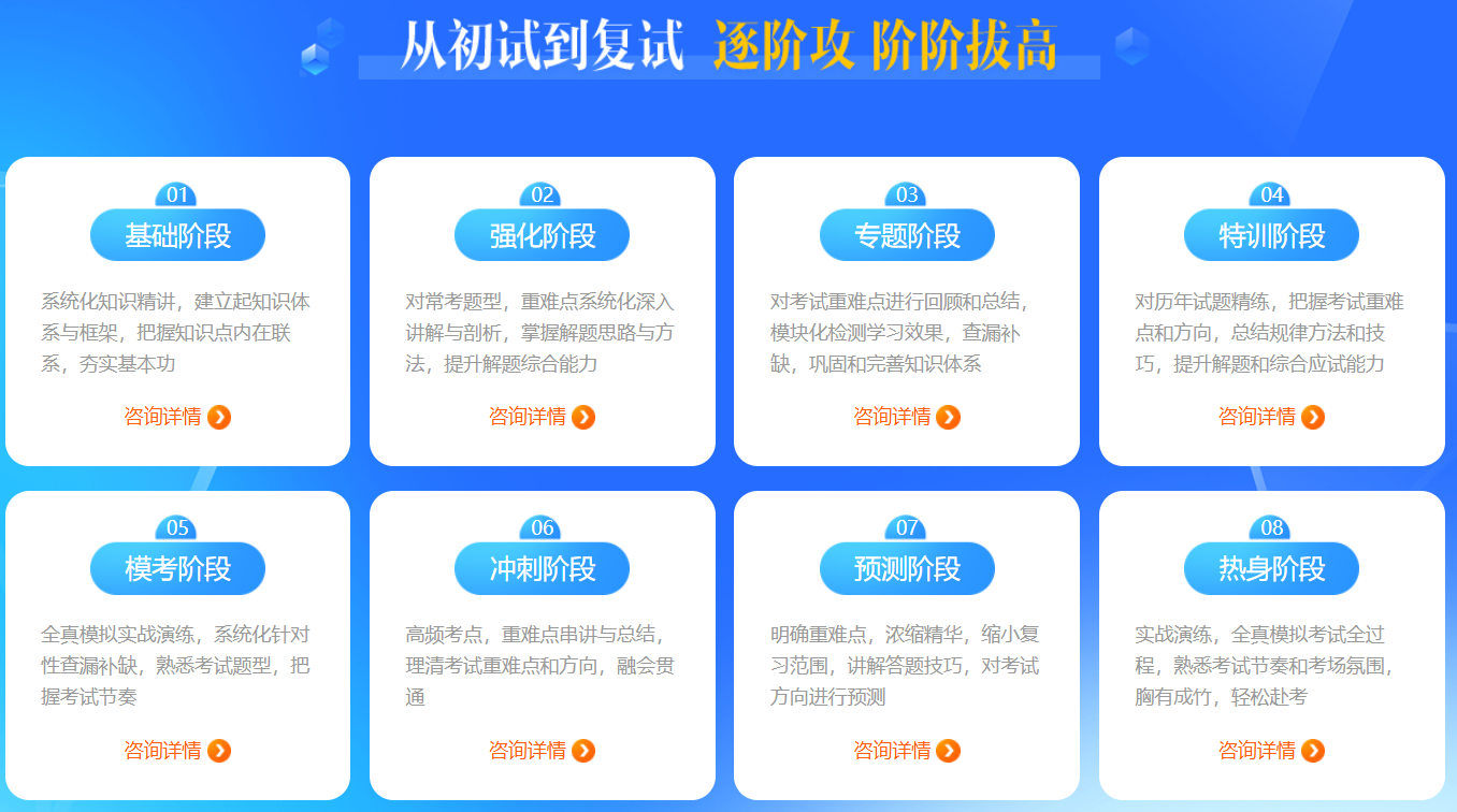 1、课程体系科学合理 政治复习重在后半年的名师指导,数学、英语复习重在扎实的基本功。我们课程安排充分体现这一原则,极具针对性地分阶段进行与考生的复习进度完全一致,真正体现课程安排的专业性和科学性。