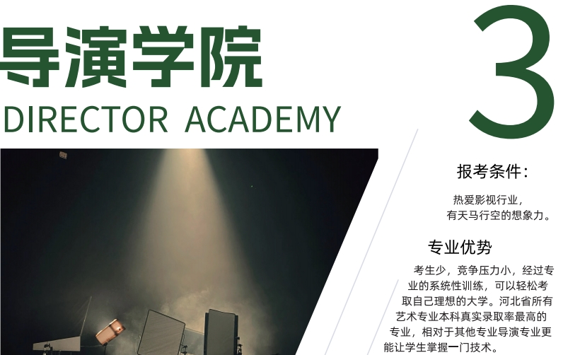 培养目标:影视导演专业旨在挖掘具备一定素质、潜质与能力的学生,通过对其在故事建构、影像造型、声音处理、表演控制及后期制作等方面的训练,培养通晓视听语言、掌握导演工作技能,具备一定想象力、创造力、执行力,能独立从事电影、电视剧、戏剧纪录片编导工作的复合型专门优质人才。