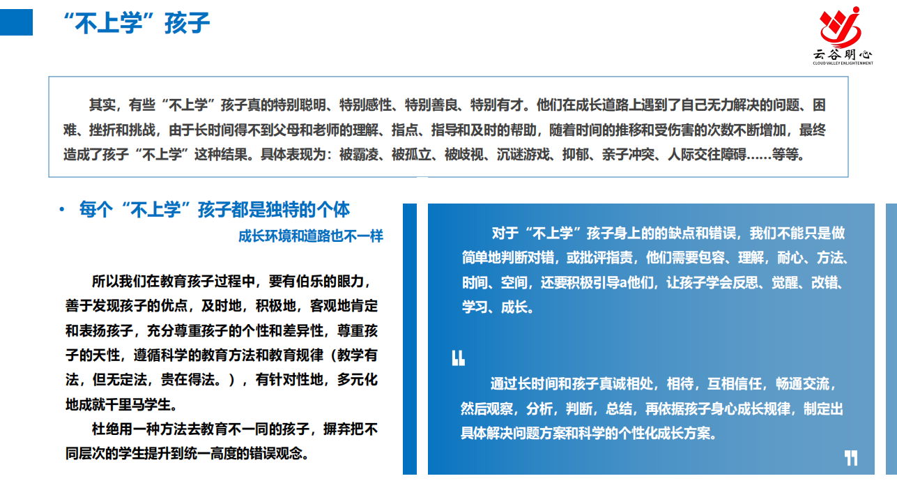 2、引导孩子学会静心、反思、觉醒,改过、成长;加强体育锻炼,增强体魄,抵抗外邪;学习圣贤经典,增长智慧,修己济人;提供或创造真实生活体验机会,从而提升孩子认知能力和水平,激发孩子求知内驱动力,使孩子自动自发重返校园,立志、勤奋好学、成人成才、改变命运,为民服务,为国争光。