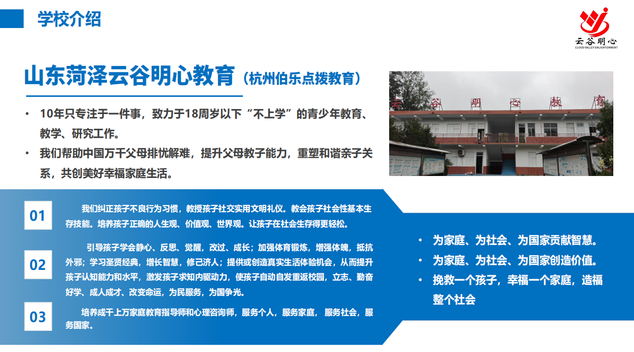 菏泽云谷明心教育是一所专注于青少年心理辅导与行为矫正的全封闭式培训机构,位于山东省菏泽市鲁西新区陈集镇保宁社区励志学校,24小时营业。该校针对叛逆、不良习惯等问题,配备专业心理咨询师,通过团体活动、个别辅导等方式进行心理疏导,同时结合行为规范训练,帮助学生养成自律、自理习惯。学校注重技能培训与兴趣培养,致力于发掘学生自我价值,减少自我封闭与叛逆行为,助力青少年健康成长。
